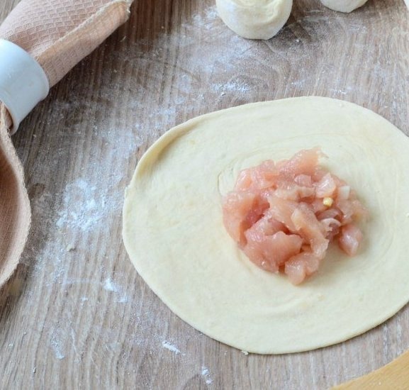 3. Ψιλοκόβουμε το κρεμμύδι, ανακατεύουμε με το κοτόπουλο, αλατοπιπερώνουμε κατά βούληση. Η γέμιση είναι έτοιμη.