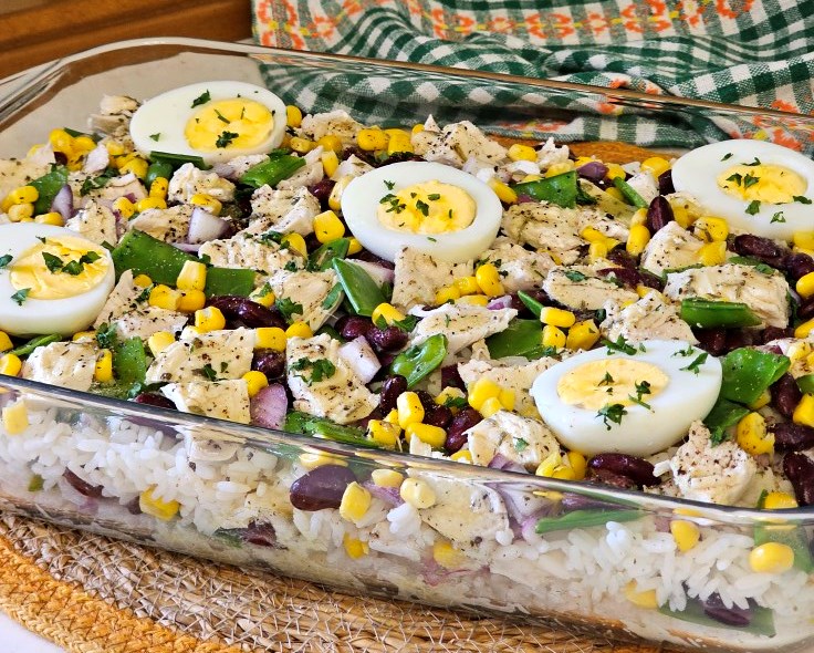 - Με αυτή τη σειρά, σκορπίζω πάνω από το ρύζι: το μισό ψιλοκομμένο κόκκινο κρεμμύδι, τη μιση πράσινη πιπεριά, τα μισά κόκκινα φασόλια, το μισό γλυκό καλαμπόκι και το μισό κοτόπουλο.