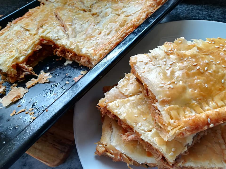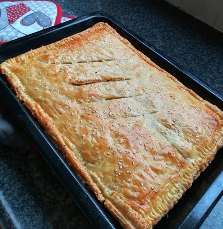 Απλώστε ένα φύλλο σφολιάτας σε ένα ταψί και τοποθετήστε με το μίγμα κοτόπουλου.