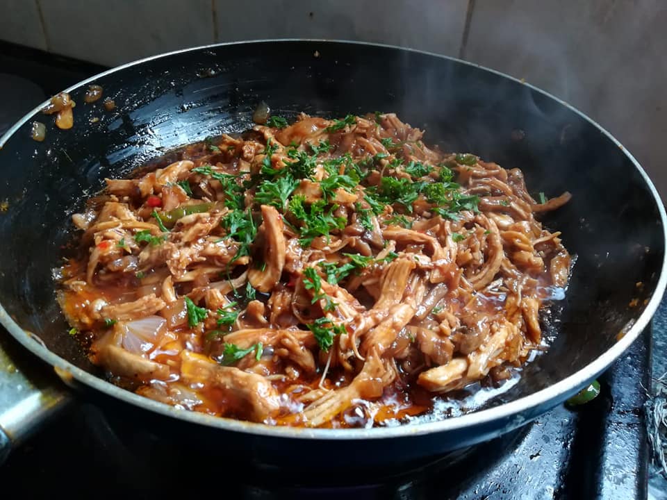 Προσθέστε το τεμαχισμένο κοτόπουλο στο τηγάνι και ανακατέψτε για 2 λεπτά, στη συνέχεια προσθέστε σάλτσα bbq και ντομάτα.