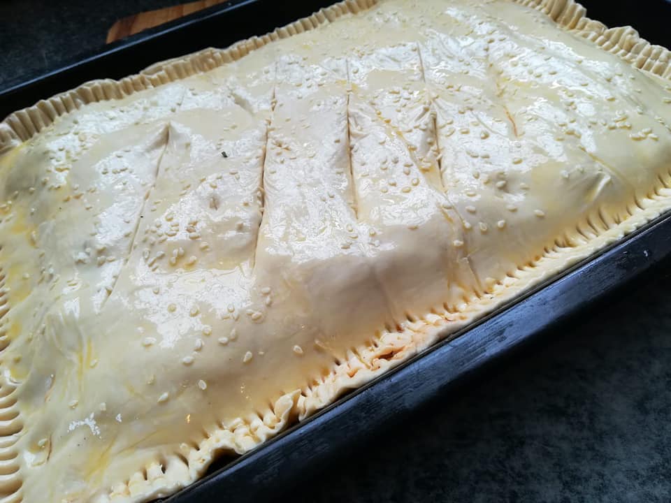 Καλύψτε με την υπόλοιπη ζύμη και σφραγίστε τα άκρα με ένα πιρούνι.