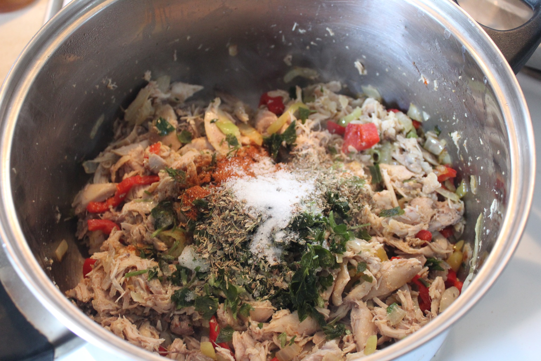 Σε μια κατσαρόλα ή ένα βαθύ τηγάνι, βάζουμε ελαιόλαδο. Κόβουμε το κρεμμύδι σε μικρά κομμάτια και τις πιπεριές σε λεπτές λωρίδες και τα σοτάρουμε σε μέτρια φωτιά για περίπου 10 λεπτά, μέχρι να μαλακώσουν και να καραμελώσουν. Ξεψαχνίζουμε το κοτόπουλο και το προσθέτουμε μαζί με τον μαϊντανό, το θυμάρι, την πάπρικα και το αλάτι, ανακατεύοντας με μια ξύλινη σπάτουλα.