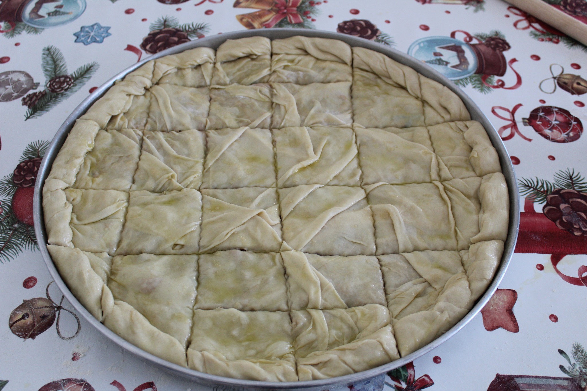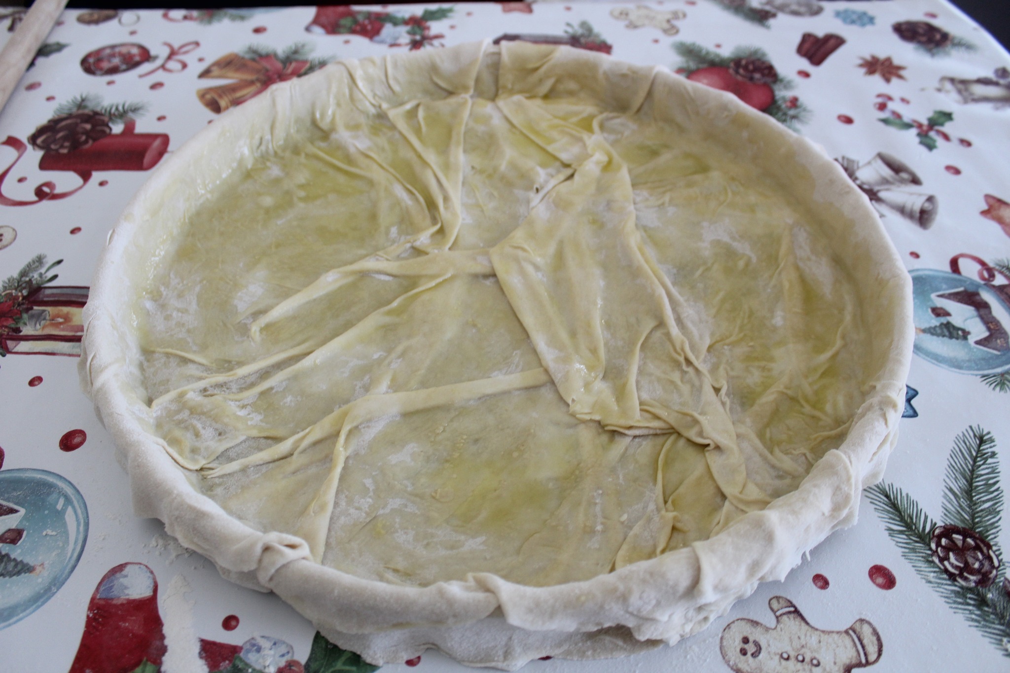 Σε ένα μεγάλο μπολ, αδειάζουμε το αλεύρι και φτιάχνουμε μια λακκούβα στο κέντρο. Εκεί ρίχνουμε το λάδι, το ξύδι και το αλάτι. Ξεκινάμε να ζυμώνουμε προσθέτοντας σταδιακά το νερό, μέχρι να αποκτήσουμε ένα ζυμάρι μέτριο, ελαστικό και που να μην κολλάει στα χέρια. Το μαζεύουμε σε μπάλα, το αλευρώνουμε ελαφρώς, το σκεπάζουμε και το αφήνουμε να ξεκουραστεί για μία ώρα. Εάν θέλουμε, μπορούμε να το βάλουμε σε μεταλλικό μπολ καλυμμένο με διαφανή μεμβράνη και να το αφήσουμε στο ψυγείο όλο το βράδυ. Χωρίζουμε τη ζύμη σε τέσσερα ίσα μέρη και ανοίγουμε ισάριθμα φύλλα. Λαδώνουμε το ταψί, στρώνουμε το πρώτο φύλλο και συνεχίζουμε με το επόμενο.