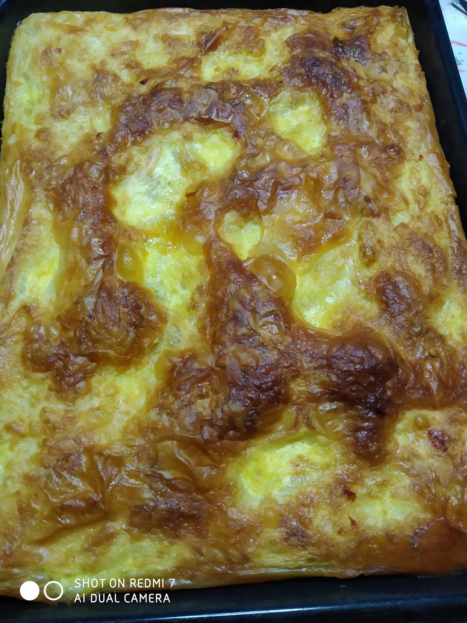 Στρώνουμε τα μισά φύλλα αφού έχουμε λαδωσει το ταψί μας και τα αλοιφουμε ένα ένα με το χυλό μας στρώνουμε τη γέμιση πάνω το τυρί και από πάνω τα άλλα μισά τα οποία αλοιφουμε με τον ίδιο τρόπο και στην επιφάνεια ραντίζουμε με λίγο ελαιόλαδο και ψήνουμε στους 200 β μέχρι να ροδισει