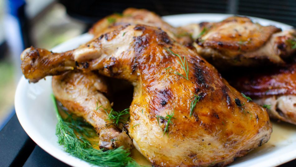Προθερμάνετε τη σχάρα σας ή το Grill σε μέτρια φωτιά. Προσθέστε κοτόπουλο στην σχάρα, από την πλευρά του δέρματος πρώτα για 6 λεπτά. Αναποδογυρίστε και μαγειρέψτε άλλα 6 λεπτά. Συνεχίστε να γυρίζετε κάθε έξι λεπτά έως ότου ολοκληρωθεί το ψήσιμο του κοτόπουλο (περίπου 25 λεπτά συνολικά). Αφαιρέστε σε ένα πιάτο και αφήστε το να ξεκουραστείτε 5 λεπτά πριν το σερβίρετε