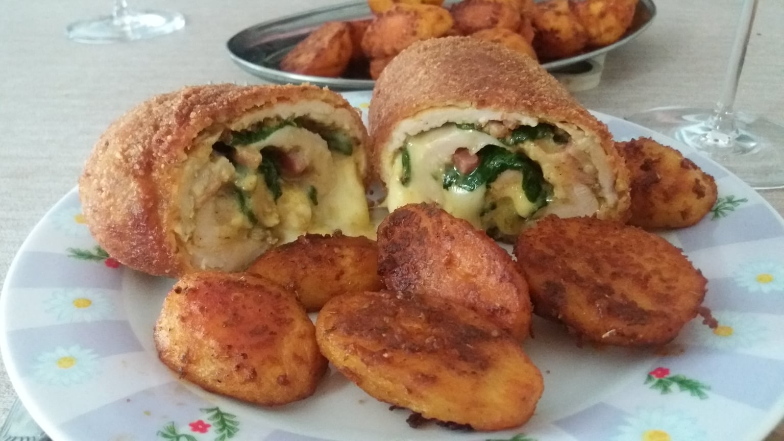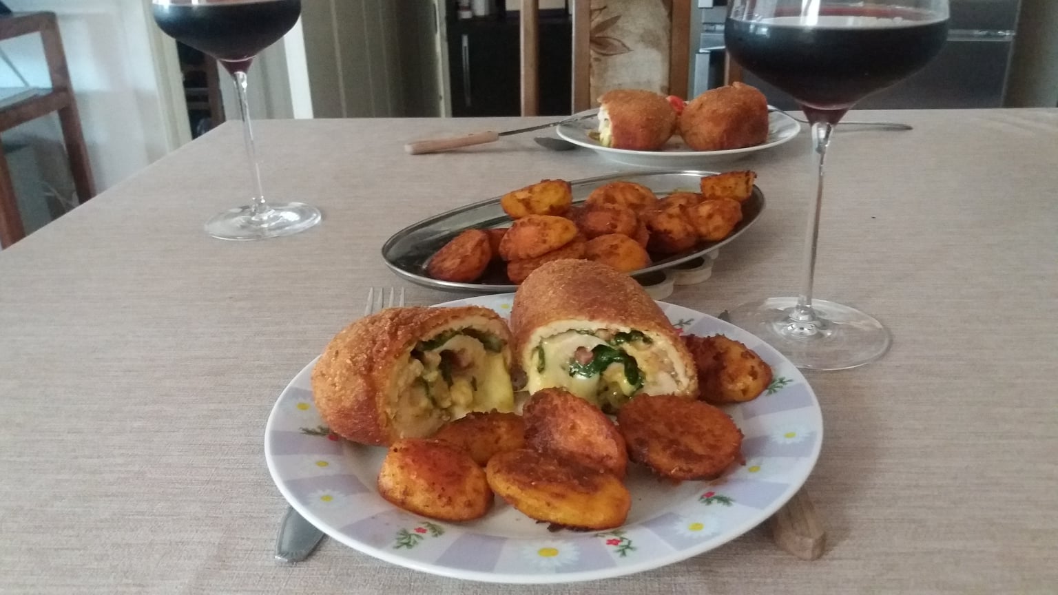 Σε ένα μπολ, σπάστε δύο αυγά, προσθέστε τα παραπάνω μπαχαρικά και χτυπήστε με ένα πιρούνι. Βάλτε αλεύρι στο δεύτερο μπολ και τριμμένη φρυγανιά στο τρίτο. Βγάζετε το κρέας από το ψυγείο. Πάρτε το πρώτο ρολό κρέατος και τυλίξτε το σε αλεύρι, μετά σε αυγά και μετά σε φρυγανιά. Το τυλίγουμε ξανά σε αυγά και φρυγανιά και το βάζουμε σε θερμαινόμενο λάδι. Κάνετε το ίδιο με το άλλο ρολό κρέατος. Τηγανίζουμε το κοτόπουλο από όλες τις πλευρές μέχρι να ροδίσει. Αφαιρέστε τα τηγανητά σε χαρτί κουζίνας για να απορροφήσει το χαρτί το περιττό λίπος.