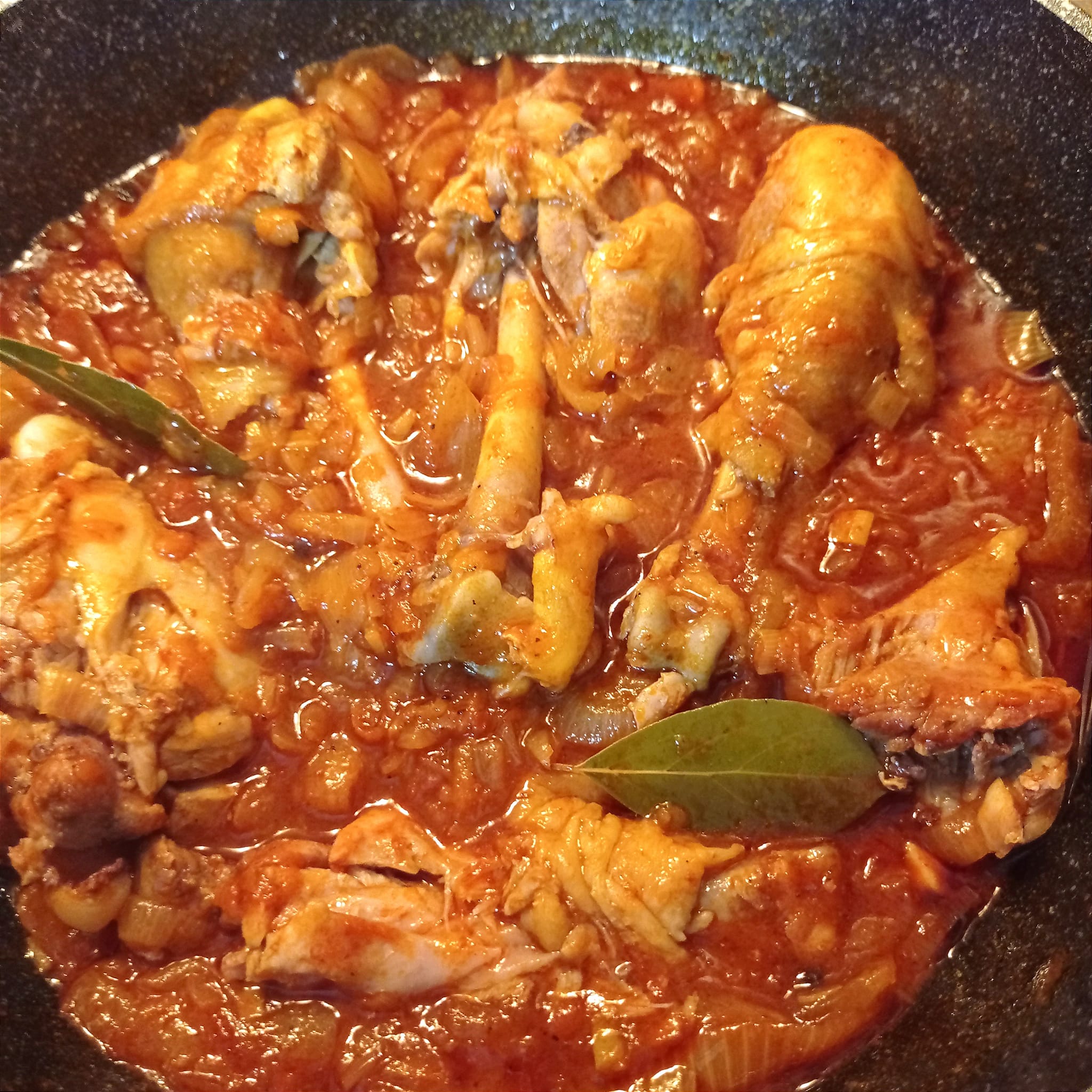 Βγάζουμε το κοτόπουλο σε ένα πιάτο και μέσα στην ίδια κατσαρόλα σοτάρουμε το κρεμμύδι, τα καρότα και το σκόρδο για 3-4 λεπτά. Βάζουμε στην κατσαρόλα το κοτόπουλο και προσθέτουμε τις ντομάτες, τον πολτό ντομάτας, το αλατοπίπερο, τη δάφνη και 2 ποτήρια ζεστό νερό. Αφήνουμε το φαγητό να βράσει περίπου μία ώρα.