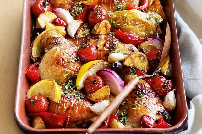 Προθερμάνετε το φούρνο στους 200 ° C / 180 ° C στο αέρα. Τοποθετήστε το κοτόπουλο σε ένα ταψί ψησίματος. Βάλτε τις πατάτες, το κρεμμύδι, την κοκκινη πιπεριά και το σκόρδο γύρω από το κοτόπουλο. Ρίξτε μέσα τον ζωμό κότας. Βγάλτε το ξύσμα από 1 λεμόνι και κρατήστε το και μετά στιψτε το λεμόνι αυτό. Κόψτε το άλλο λεμόνι σε σφήνες. Προσθέστε το χυμό λεμονιού και τις σφήνες στο ταψί. Ρίξτε αλάτι και το πιπέρι.