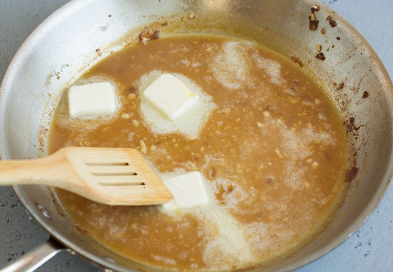 Μειώστε σε μέτρια φωτιά, προσθέτετε το σκόρδο και σοτάρετε 20 δευτερόλεπτα, ή μέχρι να πάρει ελαφρώς καφέ χρώμα, στη συνέχεια ρίξτε το ζωμό κοτόπουλου ενώ αποξύστε τα καφετιά κομμάτια να βγουν επάνω.