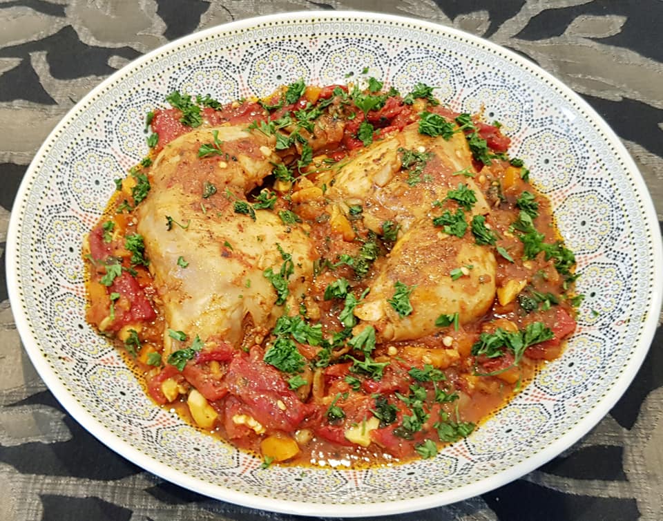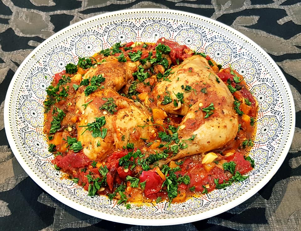 2 μπούτια κοτόπουλου χωρίς πέτσα προμαρινάρονται σε ελαιόλαδο, χυμό λεμονιού, πιπέρι και αλάτι