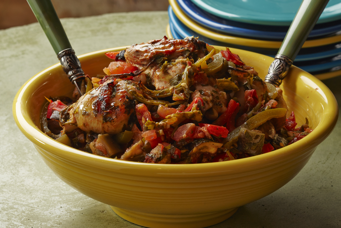 Ανακατέψτε το κοτόπουλο, την μελιτζάνα, τις πιπεριές, το σκόρδο, τις ντομάτες, το μαϊντανό, το ελαιόλαδο και το αλάτι και το πιπέρι σε ένα μεγάλο ταψί.