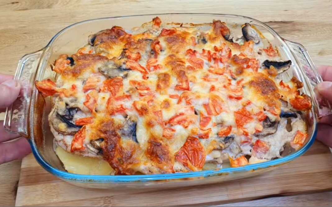 Ρίχνουμε το μείγμα στο πυρέξ πάνω απ τα μανιτάρια.