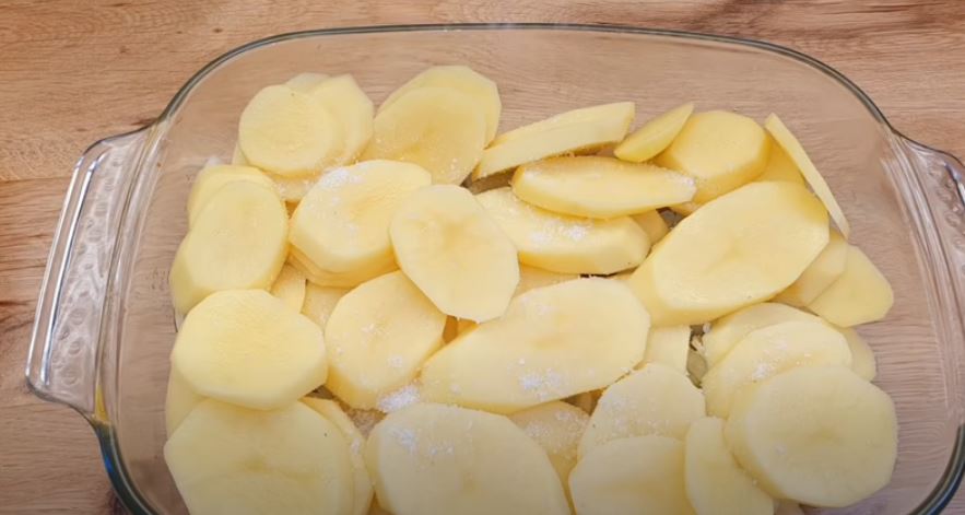 Λαδώνουμε ένα πυρέξ και ρίχνουμε πρώτα τα κρεμμύδια και μετά τις πατάτες. Αλατίζουμε.