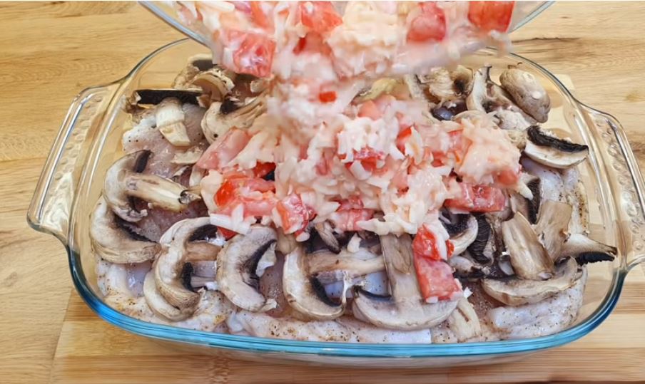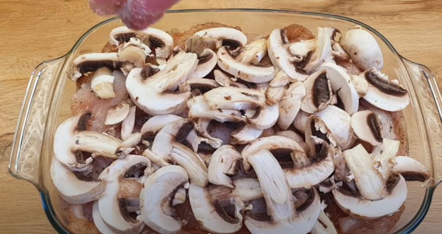 Βάζουμε απο πάνω τα μαριναρισμένα κομματάκια κοτόπουλου και στη συνέχεια τα μανιτάρια.