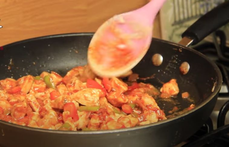 να πάρει χρώμα το κοτόπουλο. Μετά ρίχνουμε μέσα στο τηγανι τις κόκκινες πιπεριές και πράσινες πιπεριές, προσθέτουμε τοματοπελτέ προσθέτουμε μαύρο πιπέρι, πάπρικα, αλάτι και ανακατευουμε.