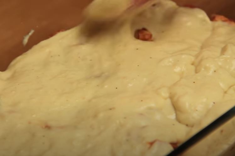 Μεταφέρετε το βούτυρο σε μια κατσαρόλα, αλεύρι και ανακατώστε σταδιακά το γάλα. Συνεχίστε να ανακατεύετε, αφήστε το να βράσει για 5 λεπτά. Ρίξτε το μαύρο πιπέρι και αλάτι ανακατώστε. Σβήστε τη φωτιά και αφήστε το να κρυώσει. Βγάλτε τις πατάτες από το φούρνο, αδειάστε και απλώστε από πάνω την σάλτσα με το κοτόπουλο. Από πάνω απλώστε την κρέμα μπεσαμέλ, απλώστε λίγο τυρί μοτσαρέλα σε αυτό