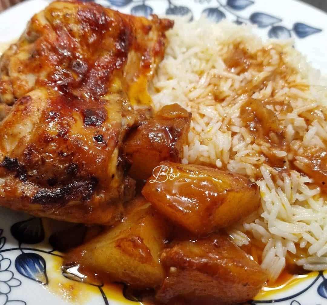 Σερβίρετε το κοτόπουλο με τις πατάτες ζεστό, συνοδευόμενο από το αρωματικό ρύζι μπασμάτι. Απολαύστε ένα γευστικό και οικείο γεύμα που θα ευχαριστήσει όλους!