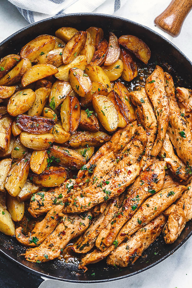 5. Ακριβώς πριν τελειώσετε το κοτόπουλο, μπορείτε να προσθέσετε την μαρινάδα και να μαγειρέψετε για ένα λεπτό. Προσθέστε μετά και τις πατάτες πίσω στο τηγάνι ανακατέψτε να πάρουν αρώματα. Ρυθμίστε το αλάτι και πιπέρι, αν το χρειάζονται ακόμη.