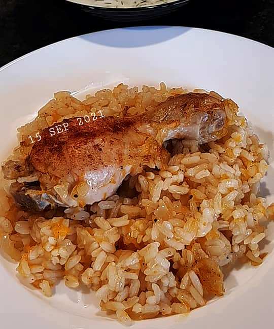 Ρίξτε το μείγμα σε ένα τηγάνι, ρίξτε το ζωμό από τα βραστά μπουτια, ανακατέψτε καλά και βάλτε τα μπουτάκια από πάνω.
