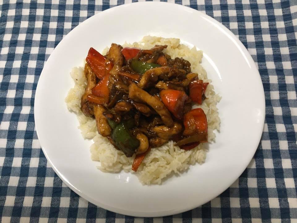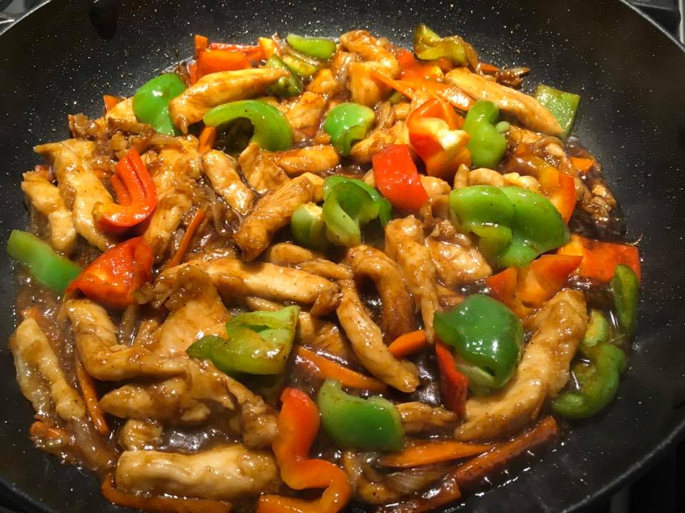 Add the garlic, ginger and then the onion and stir-fry for 30 seconds. Push the onion, garlic and ginger to the sides of the pan and add the chicken strips into the centre. Spread the chicken out as much as possible and allow to sear for about 2 minutes. Then stir-fry and combine all the ingredients. Before the chicken is cooked through, add the capsicum and carrots. Stir-fry for another 30 seconds or until the chicken is just cooked. Add the stir-fry sauce and stir-fry for another 10 seconds or until everything is well coated.