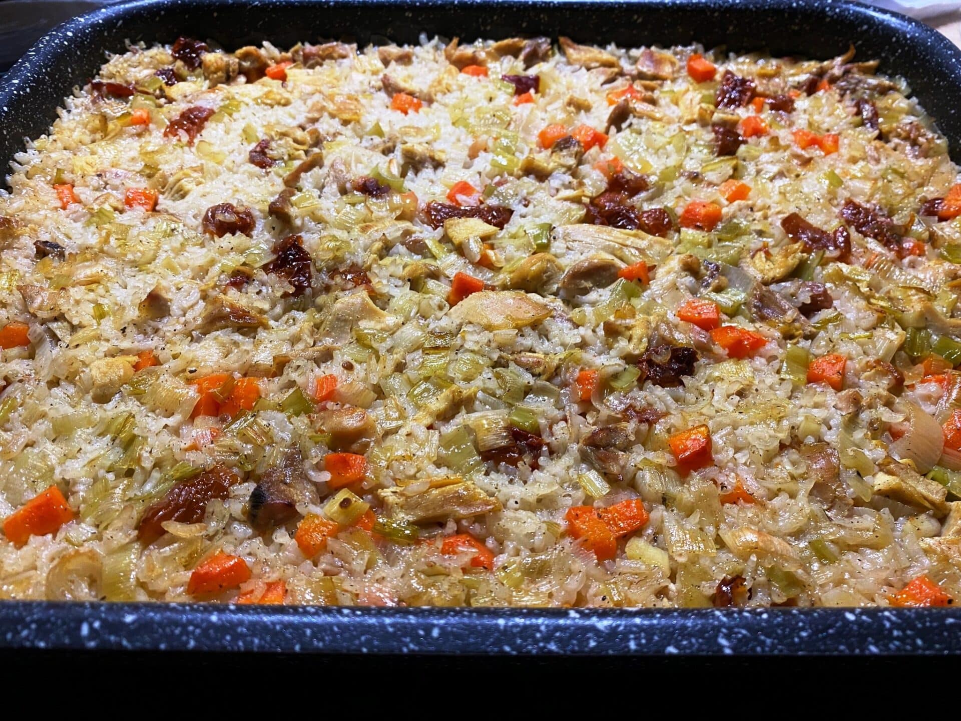 Ψήνουμε στους 200 βαθμούς για 40-45 λεπτά μέχρι το ρύζι να απορροφήσει όλα τα υγρά.