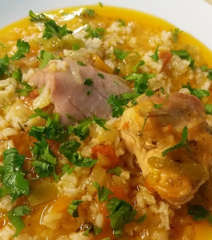 Στο ίδιο τηγάνι (χωρίς να το ξεπλύνεις!), σοτάρουμε τα ψιλοκομμένα λαχανικά, προσθέτουμε το πλυμένο ρύζι, αλατίζουμε, τηγανίζουμε μέχρι να γίνει διάφανο, ρίχνουμε 5 κούπες νερό, Μόλις το ρύζι πιει το νερό και βράσει προσθέτουμε την τριμμένη ντομάτα και το κοτόπουλο (η δικια μ είναι κονσέρβα), την ρίγανη και το μαύρο πιπέρι