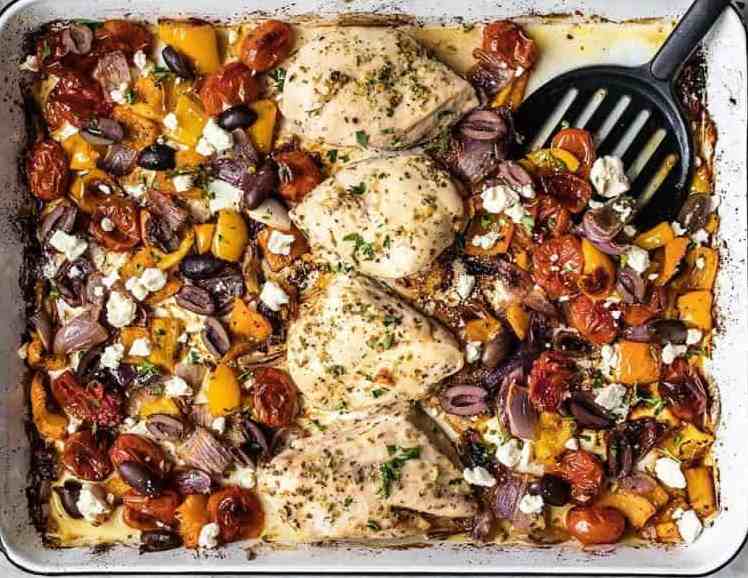 Κόψτε τις ελιές στη μέση. Πασπαλίστε τις ελιές, την φέτα, το ξύσμα λεμονιού και το μαϊντανό πάνω από το κοτόπουλο και τα λαχανικά μετά το ψήσιμο, στη συνέχεια, σερβίρετε (με ρύζι, αν θέλετε).