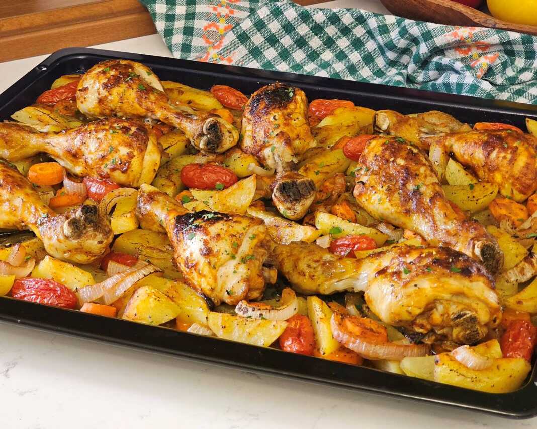 Κοτόπουλο Μπούτια Μαριναρισμένα με Πατάτες και Λαχανικά