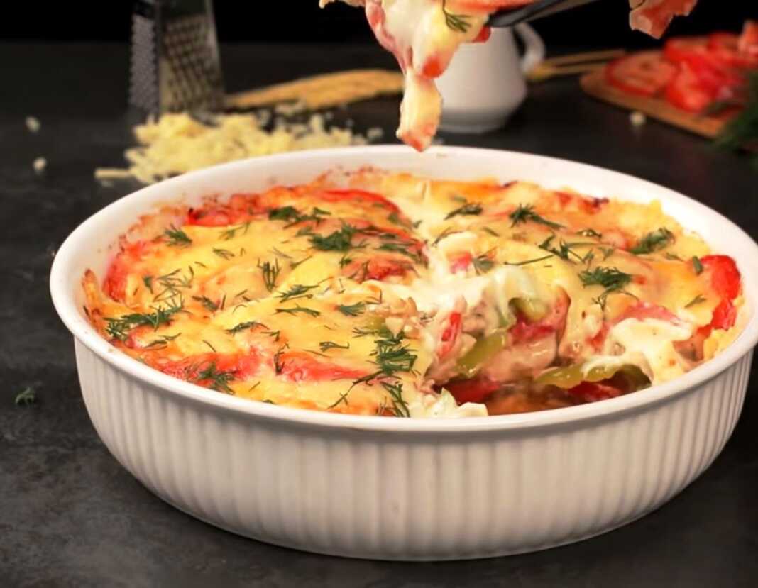 Στο ταψάκι ρίχνουμε τα κρεμμύδια , από πάνω τις πιπεριές, και τέλος το κοτόπουλο