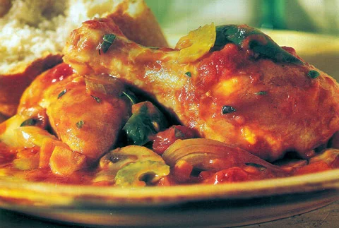 • Ζεστάνετε το λάδι σε ένα μεγάλο τηγάνι και βάλτε το κοτόπουλο να ροδίσει ομοιόμορφα. Στραγγίστε το σε απορροφητικό χαρτί. Στο ίδιο τηγάνι σοτάρετε το κρεμμύδι, το σκόρδο και την πιπεριά μέχρι να μαλακώσουν.