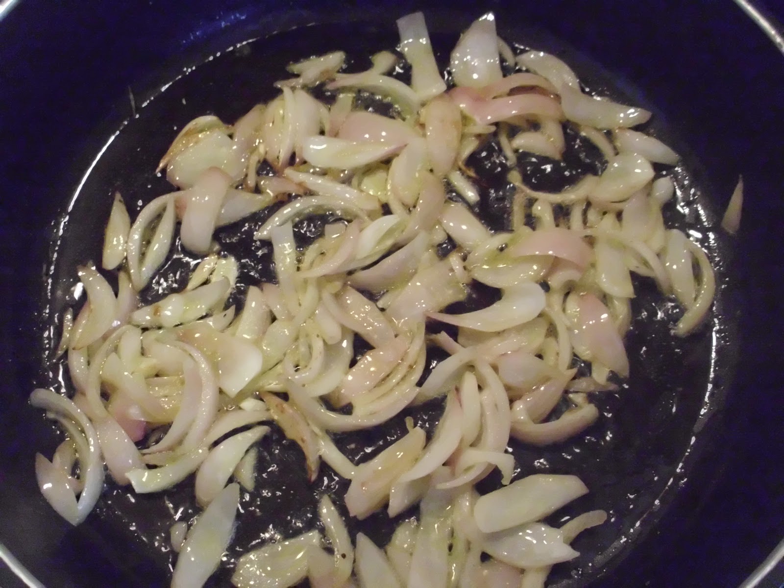 Σε φαρδύ και βαθύ τηγάνι βάζουμε το ελαιόλαδο να ”κάψει” ελαφρά και ρίχνουμε τα κρεμμύδια (κομμένα σε λεπτές φέτες). Τσιγαρίζουμε ελαφρά.