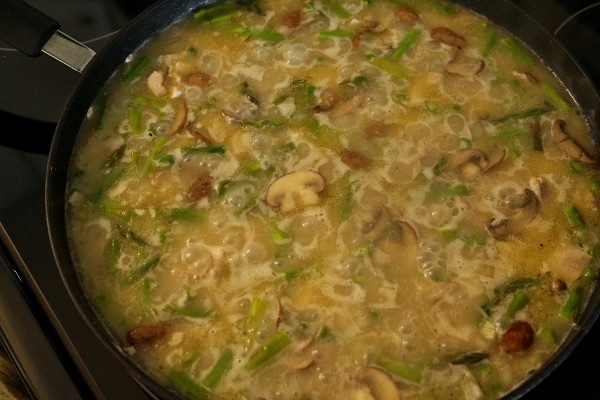 Προσθέστε το κρεμμύδι, σπαράγγια και μανιτάρια. Μαγειρέψτε μέχρι το κρεμμύδι να είναι ημιδιαφανές.