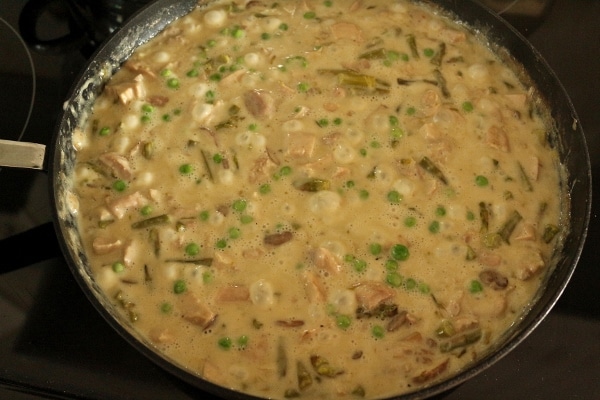 Αλατοπιπερώνετε με αλάτι και πιπέρι. Ανακατεύουμε αργά την κρέμα γάλακτος. Χαμηλώστε σε μέτρια χαμηλή φωτιά και μαγειρέψτε έως ότου πήξει, περίπου 7 λεπτά. Ανακατεύουμε τον αρακά. Σερβίρετε με πιλάφι ρυζιού.