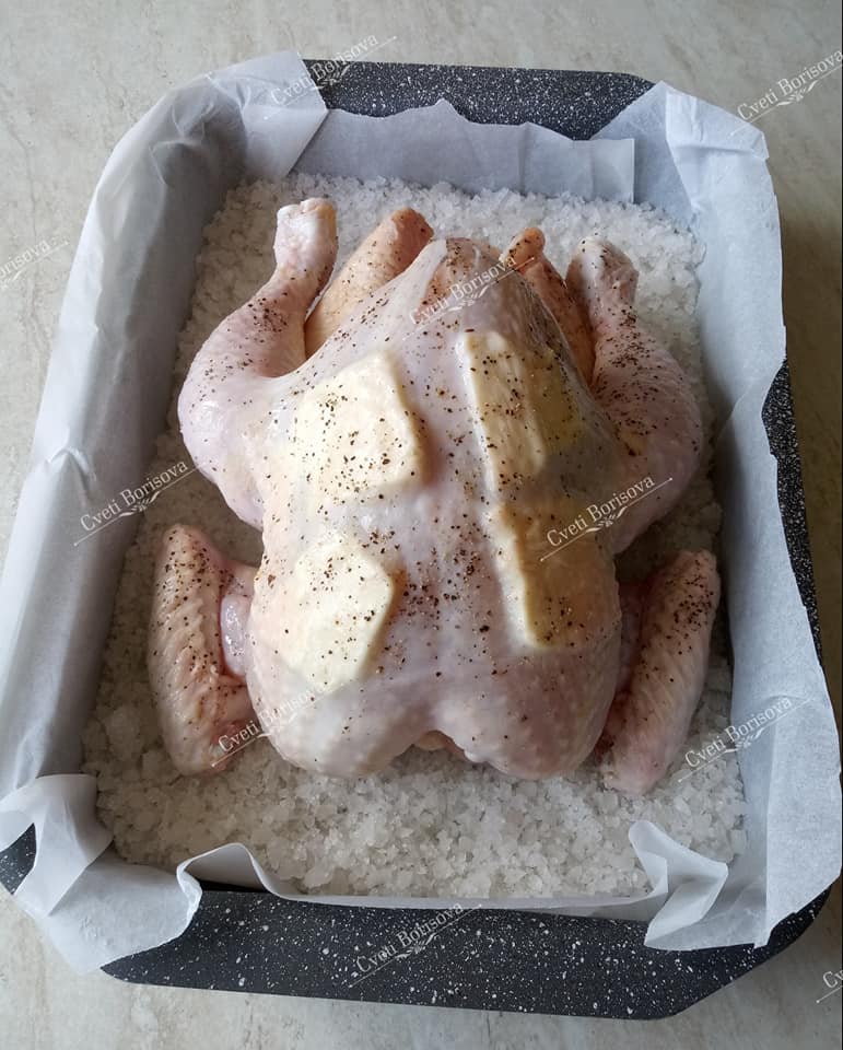 Βάζουμε το στήθος κοτόπουλου επάνω στο αλάτι. Ρίχνουμε πολύ λίγο αλάτι πάνω από το κοτόπουλο, απορροφάει όσο ψήνεται από το αλάτι στο ταψί. Ψήνουμε για μιάμιση ώρα (ανάλογα με το πόσο μεγάλο είναι το κοτόπουλο)