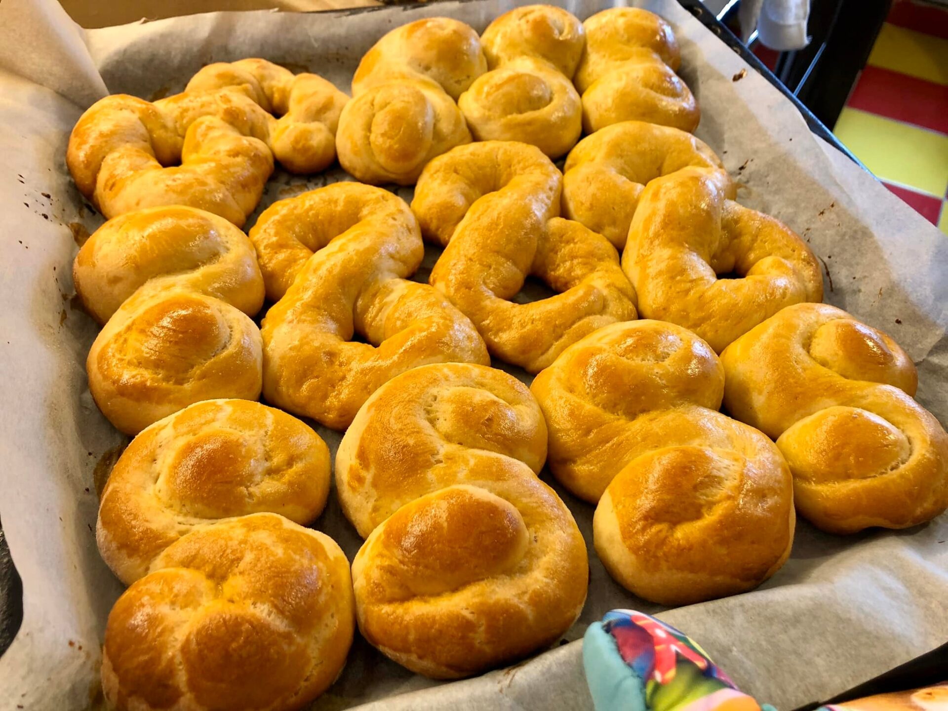 Ανοίγουμε κάθε μπαλάκι στο τραπέζι πασπαλισμένο με αλεύρι μέχρι να γίνει ένα λεπτό κορδόνι και μετά κάνουμε ένα οκτώ, τα βάζουμε στο ταψί αλειμμένο με λάδι και πασπαλισμένο με αλεύρι ,,,, ή στρωμένο με χαρτί ψησίματος αλείφουμε με χτυπημένο κρόκο αυγού