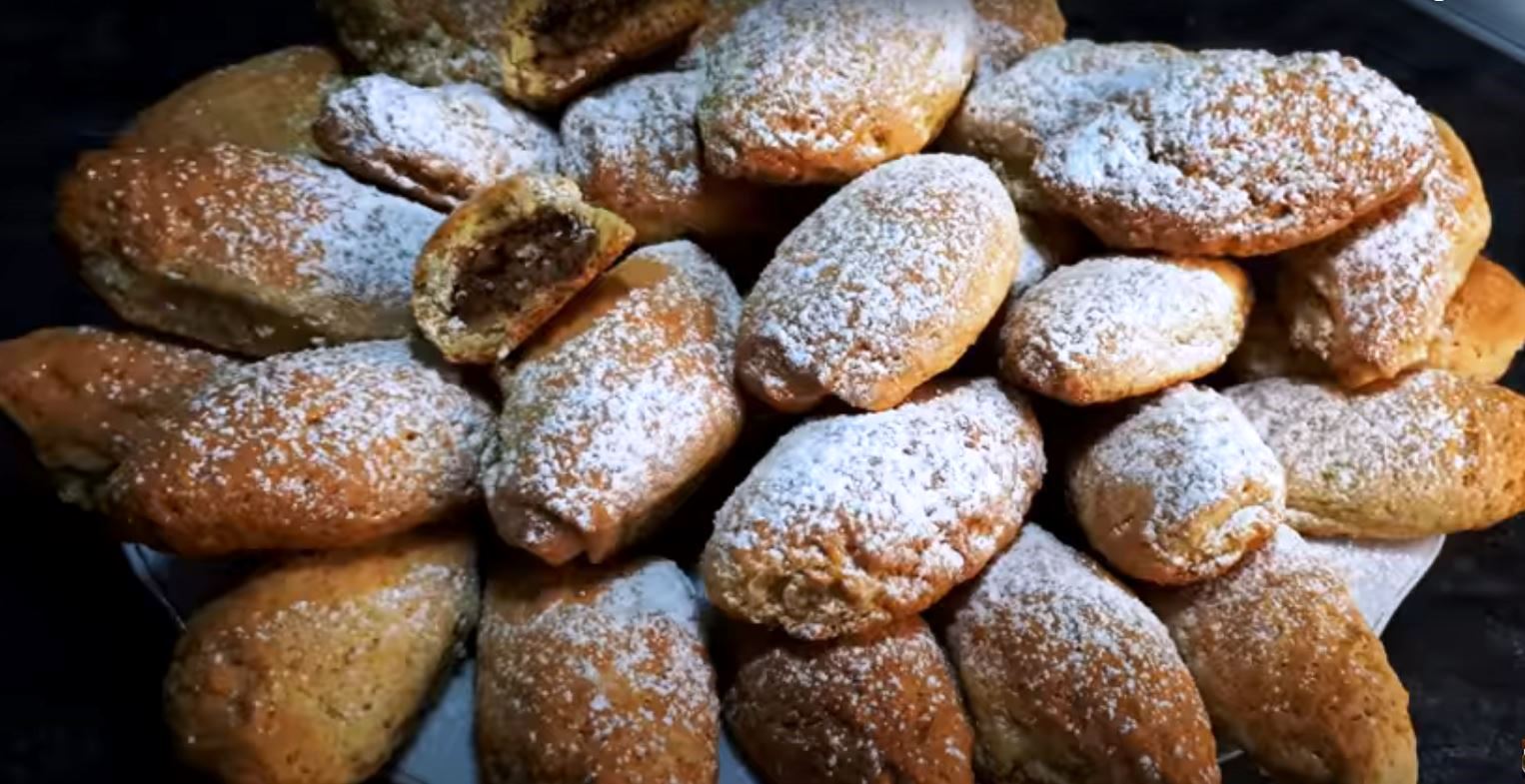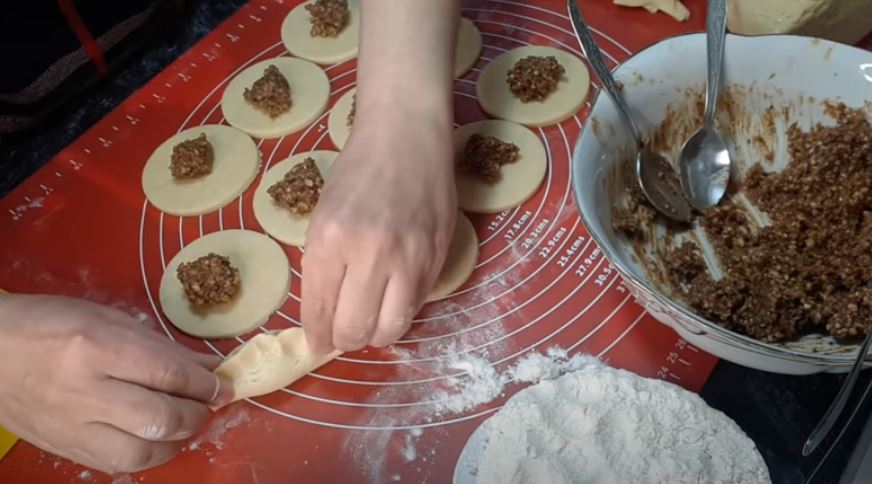 Βάζουμε τη γέμιση στο κέντρο κάθε κύκλου και φτιάχνουμε τα μπισκότα διπλώνοντας στην μέση να κλεισουμε τα καρύδια στο εσωτερικό.