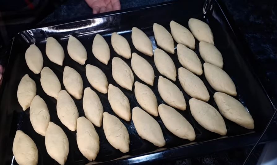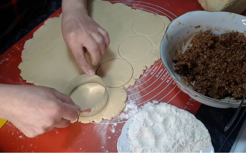 Βγάζουμε τη ζύμη, τη ανοίγμουμε σε ένα λεπτό στρώμα πάχους 5 mm και κόβουμε σε κύκλους με ένα κουπ πατ.
