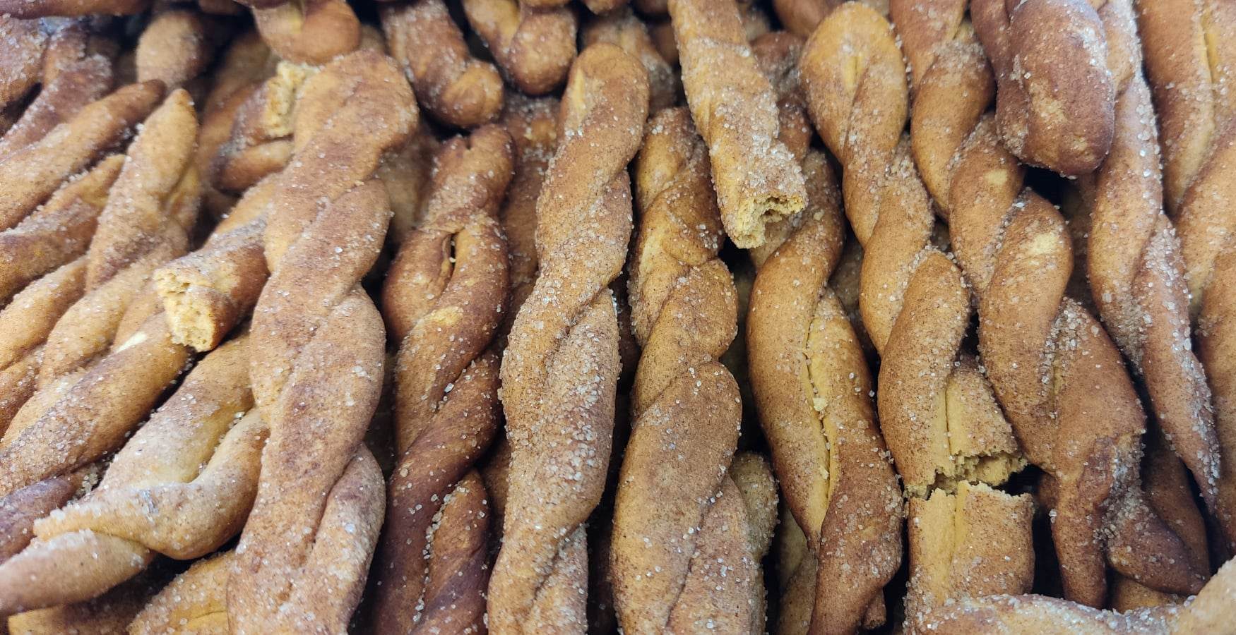 Ανακατεύουμε τη ζάχαρη με το λάδι καλά σε άλλο μπολ το χυμό με τη σόδα..τα ριχνω μαζί κ βάζω τα υπόλοιπα υλικά..σιγά σιγά το αλεύρι πήρε περιπου ενα κιλό…η ζύμη είναι έτοιμη οταν δεν κολλάει στα χέρια..κάνουμε το σχεδιακι σε κοτσιδακι κ τα βουτάμε στη ζάχαρη..εγω έκανα κ λιγες καρδούλες χωρίς ζάχαρη για τη μικρή μου…ψήνουμε στους 180 βαθμούς για 20 λεπτά.
