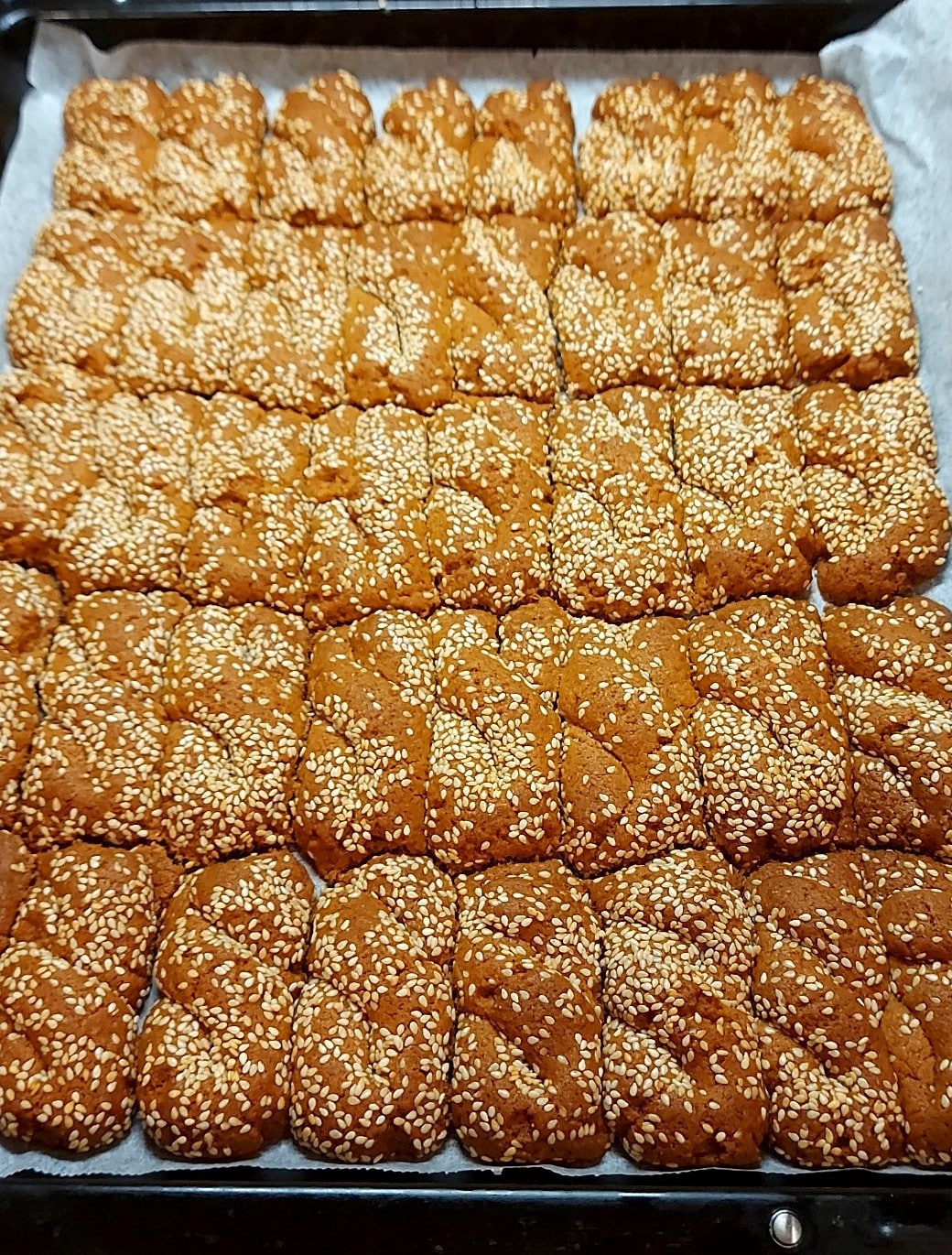 Βουτάμε τα κουλουράκια στο σουσάμι και τα τοποθετούμε στο ταψί.