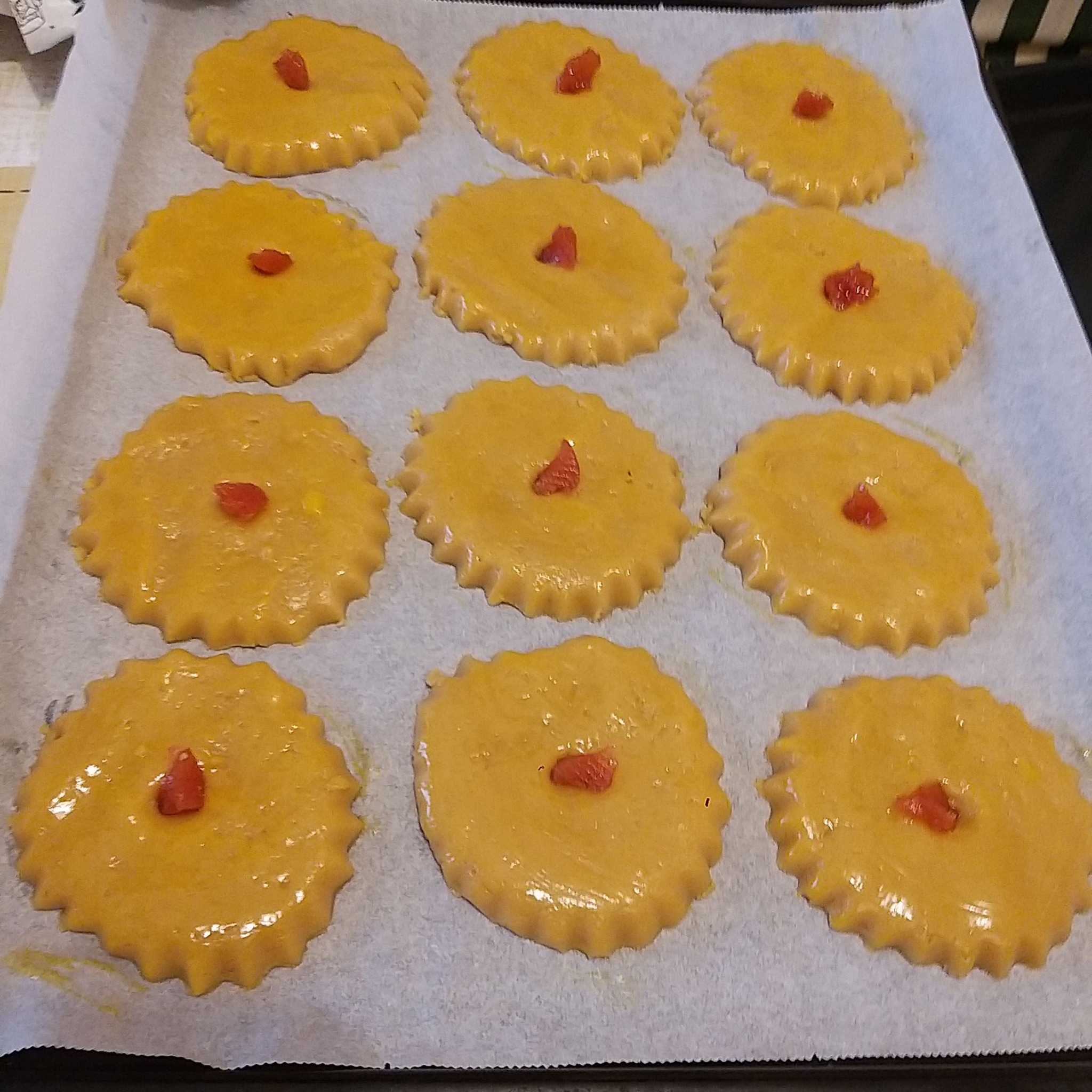 Αλείφω τα κουλουράκια με τον κρόκο αυγού και τα διακοσμώ με τα κομμάτια γλυκού του κουταλιού.