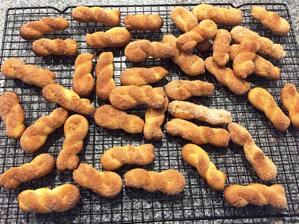 Ζεστά από το φούρνο τα βάζω γρήγορα σε κρύο νερό και έπειτα σε μίγμα ζάχαρης από κανέλα.
