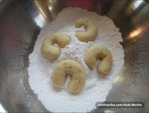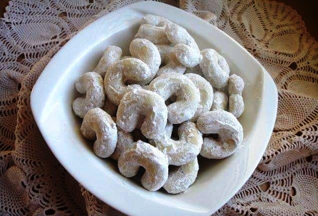 1 Ανακατεύουμε το κοσκινισμένο αλεύρι, με κοσκινισμένη άχνη ζάχαρη και κομμάτια μαργαρίνη ή βούτυρο. Χτυπάμε σε ένα μιξερ βασης και όταν έχουμε ένα ομοιόμορφο μείγμα, προσθέτουμε ένα ασπράδι αυγού, τα καρύδια και το ανακατεύουμε επίσης.