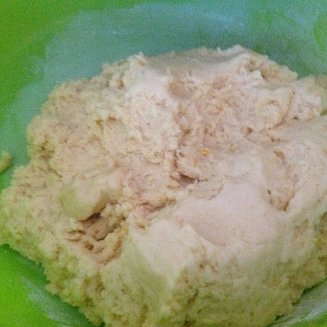 Σταματήστε να χτυπάτε και ρίχνετε και ανακατεύετε το ξύσμα και το αλεύρι με το μπεικιν σε δόσεις, για να κάνετε μια μαλακή ζύμη που δεν κολλά στα δάκτυλα.
