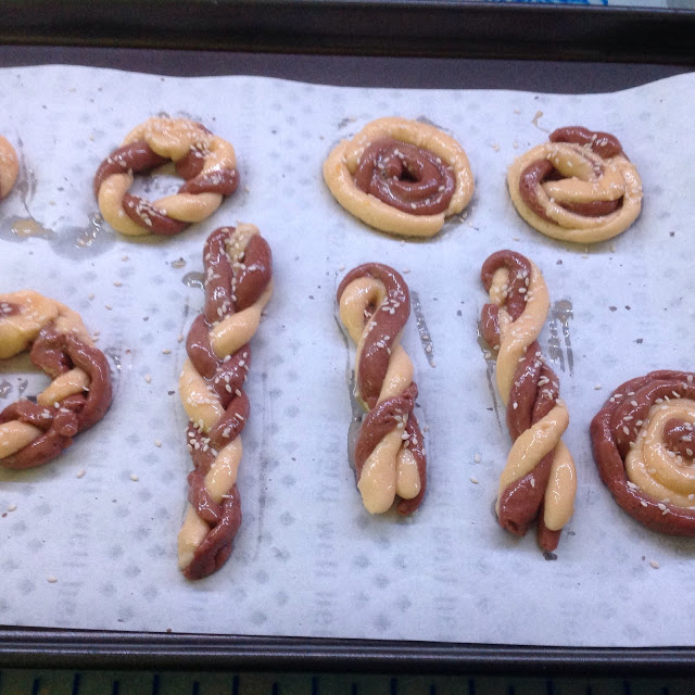 Χωρίστε τη ζύμη σε 2 μέρη και στην μία προσθέσετε κοσκινισμένο κακάο για να κάνετε την κάνετε σοκολάτα.