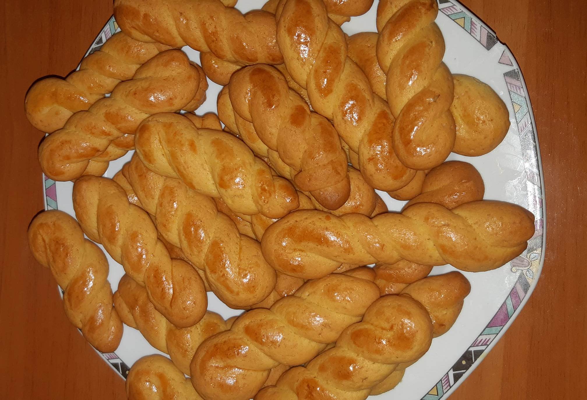 Χωρίζουμε τη ζύμη σε 4 ίσα μέρη. Στρίβετε κάθε μέρος στον πάγκο, μέχρι να πάρετε ένα ρολό από το οποίο μπορείτε να κόψετε 8-9 κομμάτια, το οποίο τυλίγετε το καθένα και τα πλάθετε όπως έκανα εγώ και τα στριβετε σε κοτσίδα ή, μπορείτε να του δώσετε όποιο σχήμα θέλετε. Τα λαδώνουμε με λίγο κρόκο αυγού αραιωμένο με νερό, πριν τα βάλουμε στο φούρνο.