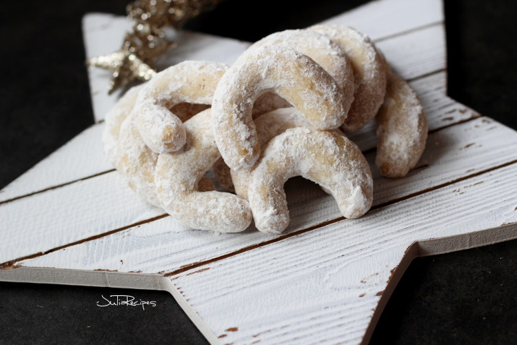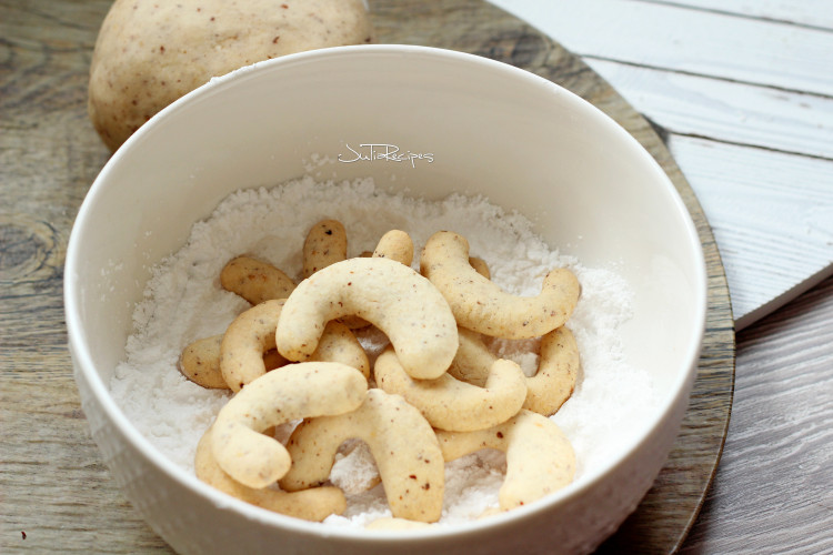 Σε ένα μεσαίο κύπελλο, ανακατεύουμε τώρα τη ζάχαρη άχνη με ζάχαρη με βανίλια και μόλις ψηθούν (αφήστε τα να κρυώσουν λίγο) και ανακατέψτε τα σε αυτό το μείγμα ζάχαρης. 😉