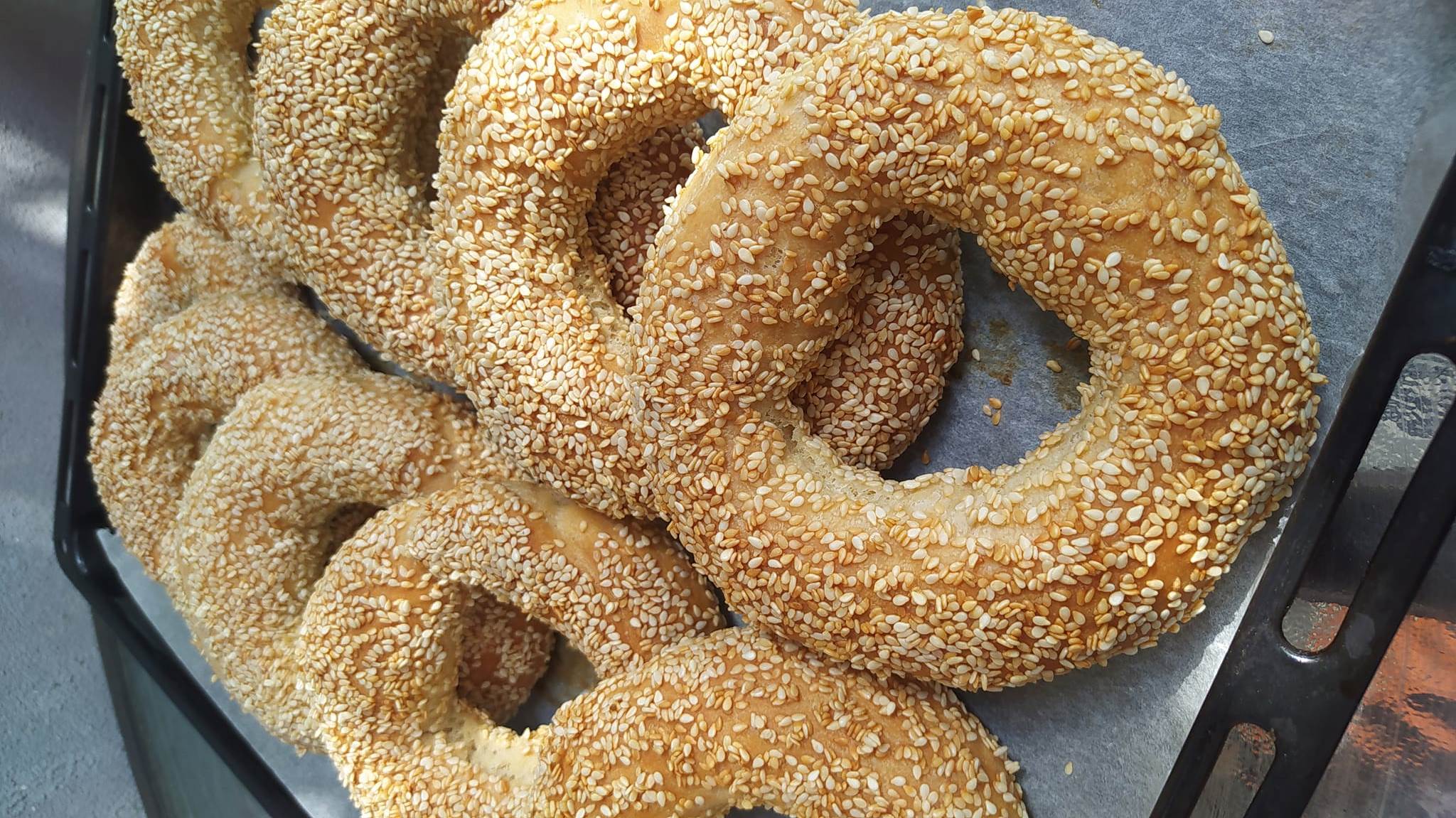 Βουτάμε κάθε κουλούρι στο μείγμα νερού-μελιού και στη συνέχεια το κυλάμε στο σουσάμι για να καλυφθεί καλά.