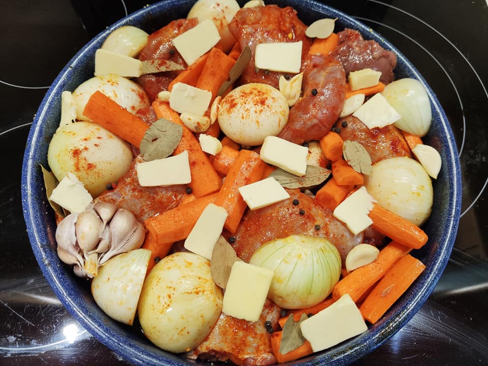 Αλατοπιπερώνουμε με μαύρο πιπέρι και φύλλα δάφνης. Προσθέτω νερό, λάδι και βούτυρο.