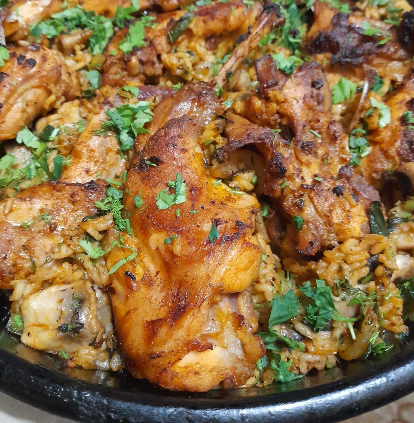 Έριξα νερό και έβρασα μέχρι να μαλακώσει το ρύζι. Έριξα το ρύζι σε ένα ταψί, έβγαλα το κρέας, άλειψα κάθε κομμάτι του κρέατος με λιωμένο βούτυρο και πιπέρι, το απλώσα πάνω στο ρύζι και το έψησα για λίγο για να κάνει κρούστα το κρέας.