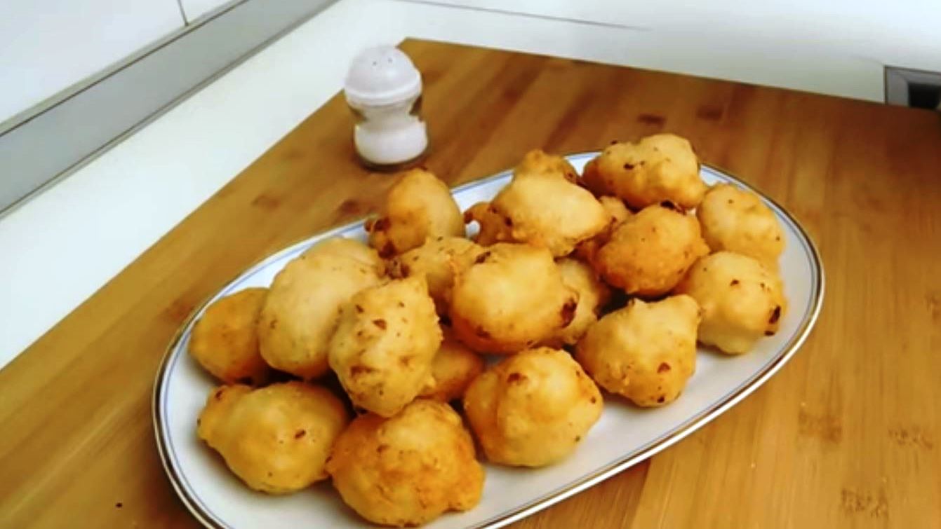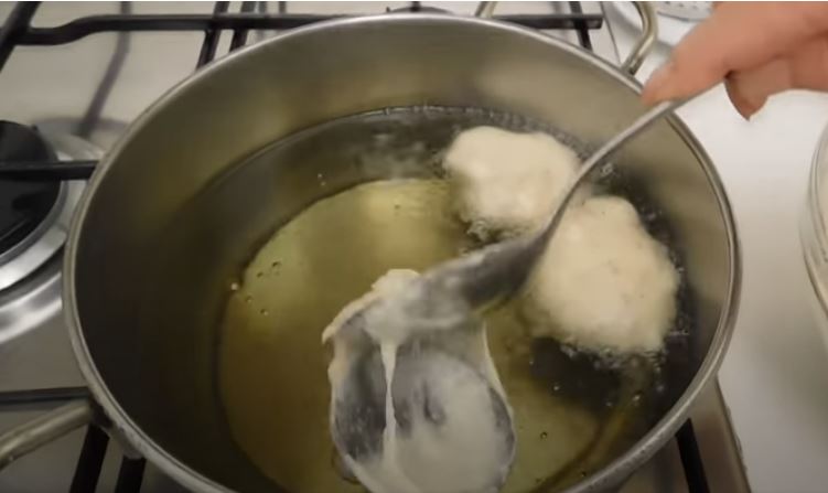Παίρνουμε κουταλιές (σαν λουκουμάδε) και τηγανίζουμε σε σπορέλαιο στους 170 ° C.